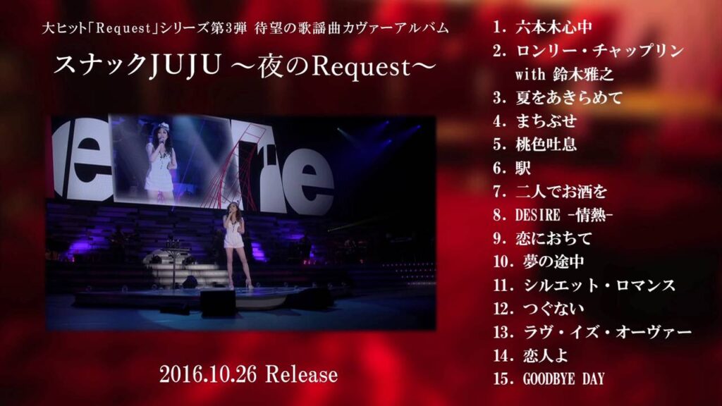JUJU 10.26発売「スナックJUJU ~夜のRequest~」全曲ダイジェストムービー JUJU 「まちぶせ」 -Snack JuJu.2016- JUJU 「夏をあきらめて」 -Snack JuJu.2016- JUJU「ラヴ・イズ・オーヴァー」LIVE -