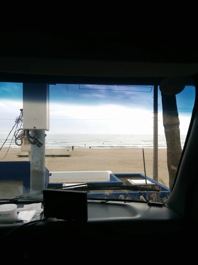 曇り風弱いですが海面はややざわついてるかな。波は膝、腰です。 仲間は早朝から入ってますがウインドバカは今朝も寒さに負けてまだ入っていません。 これからかな。 -